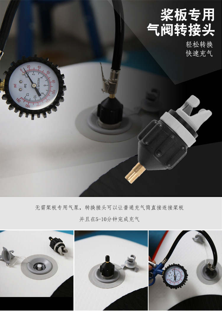 З цим багатофункціональним адаптером для клапана насоса SUP ви заощадите час і зусилля. Він не тільки спрощує процес накачування, але й забезпечує надійну герметичність, запобігаючи витоку повітря.