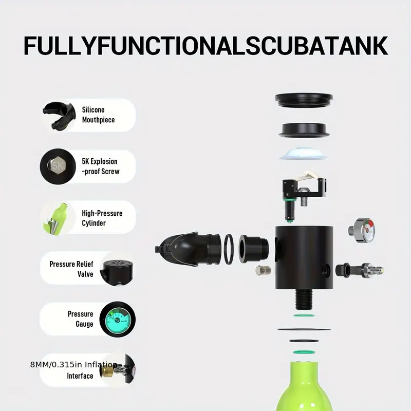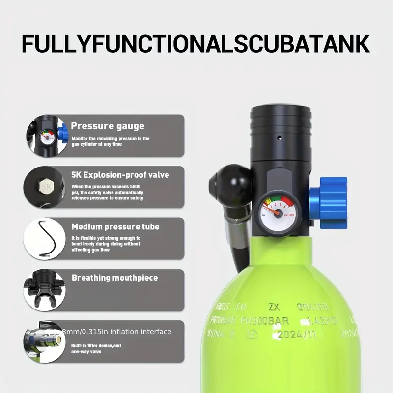 - Цей комплект призначений для коротких занурень, оскільки 1-літровий балон забезпечує автономність від 15 до 25 хвилин.