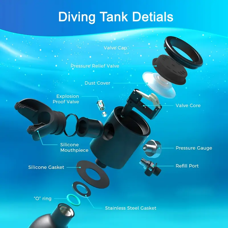 Балон складається з різних частин, таких як вентиль, манометр, штуцер для заправки, запобіжний клапан та мундштук.