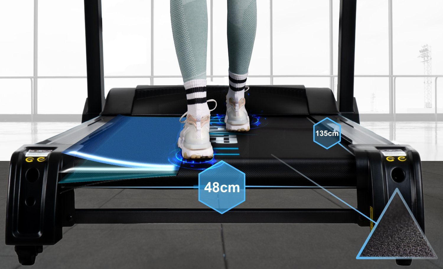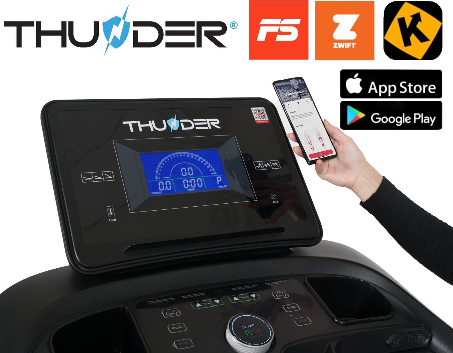 Бігова доріжка від THUNDER оснащена енергоефективним двигуном на 4 к.с. з піковою потужністю до 6 к.с. Він здатний забезпечити швидкість руху в діапазоні від 1 до 20 км/год. Трикомпонентне бігове полотно має нековзну структуру та підвищену зносостійкість, його розміри становлять 48 x 135 см.
