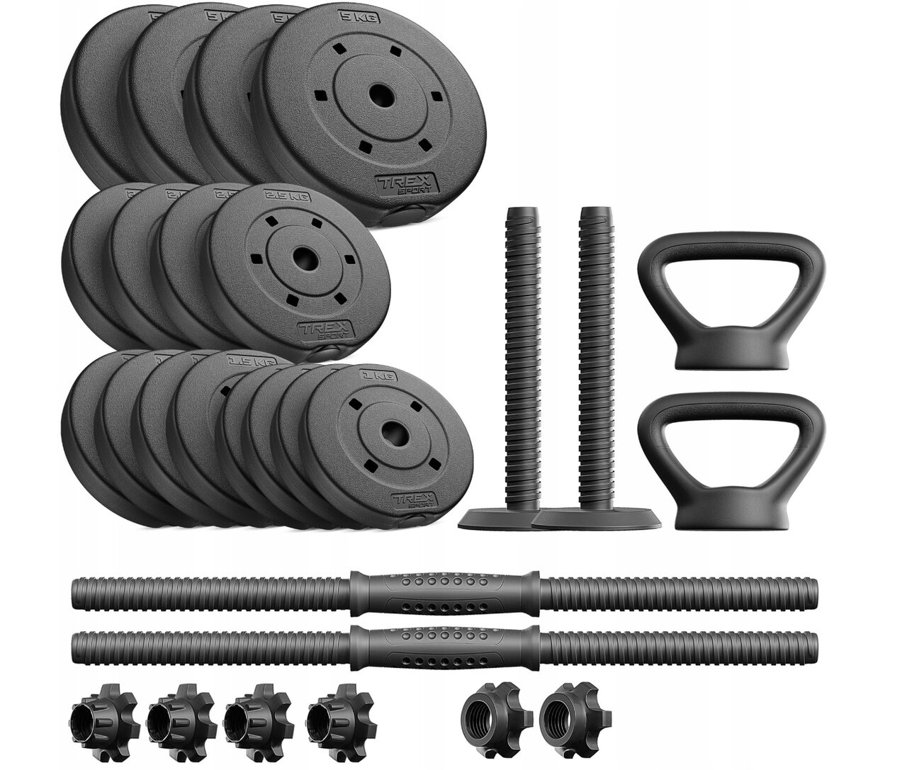 Ваше тренування, ваші правила! Різна вага дозволяє контролювати інтенсивність. Це робить їх ідеальними для всіх — від початківців до досвідчених користувачів. Весь набір компактний , що дозволяє легко зберігати його будь-де. Грифи, гиря та з’єднувач посилені металевим сердечником, що значно підвищує їхню міцність та стабільність.