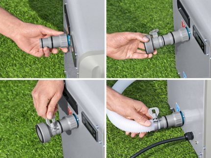 Насос містить усі компоненти, необхідні для його роботи. Діаметр патрубка 38 мм, в комплект входить приведення до діаметра випуску басейну 32 мм.